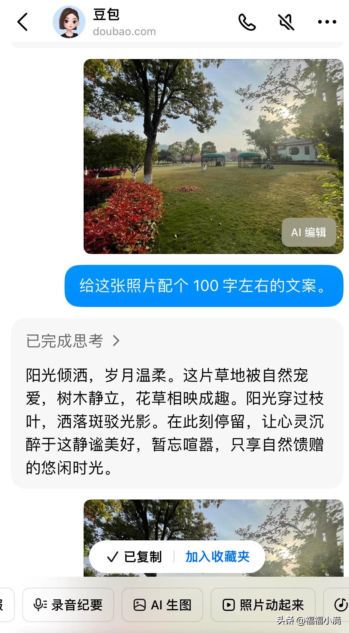 然后,我们可以对豆包说,帮我给这个照片配100字左右的文案,我想发到朋友圈里!