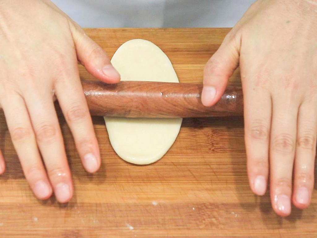 都松弛好之后,取一个油皮面团把油酥包起来,然后用手摁扁,擀成牛舌状然后卷起来,再擀一次卷起来。这样反复两次操作,面皮才能更好地起酥分层。