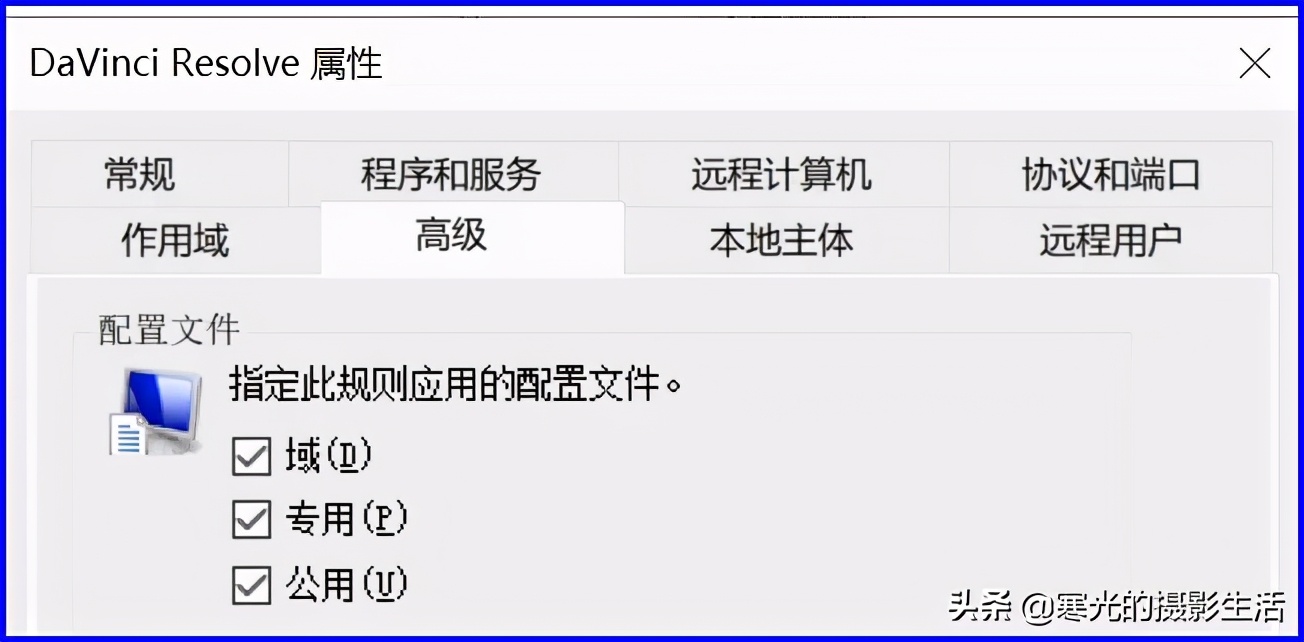 通过网上搜索找到的解决办法并不靠谱,排在前面的几个方案似乎来自于同一文章和视频,解决办法是:在防火墙设置里,先进入到“入站规则”,找到DaVinci开头的项目,修改其配置文件,把“指定此规则应用的配置文件”下的域、专用、公用全部勾选上(如图三、图四),并按照这个操作把其他所有davinci开头的规则都修改一遍。