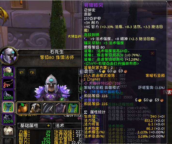 这是以上这一套装备的无BUFF满宝石满附魔的属性面板,法强2286,命中等级219满,暴击28.17%,急速等级563提高施法速度17%,面板可以说是非常的亮眼了。