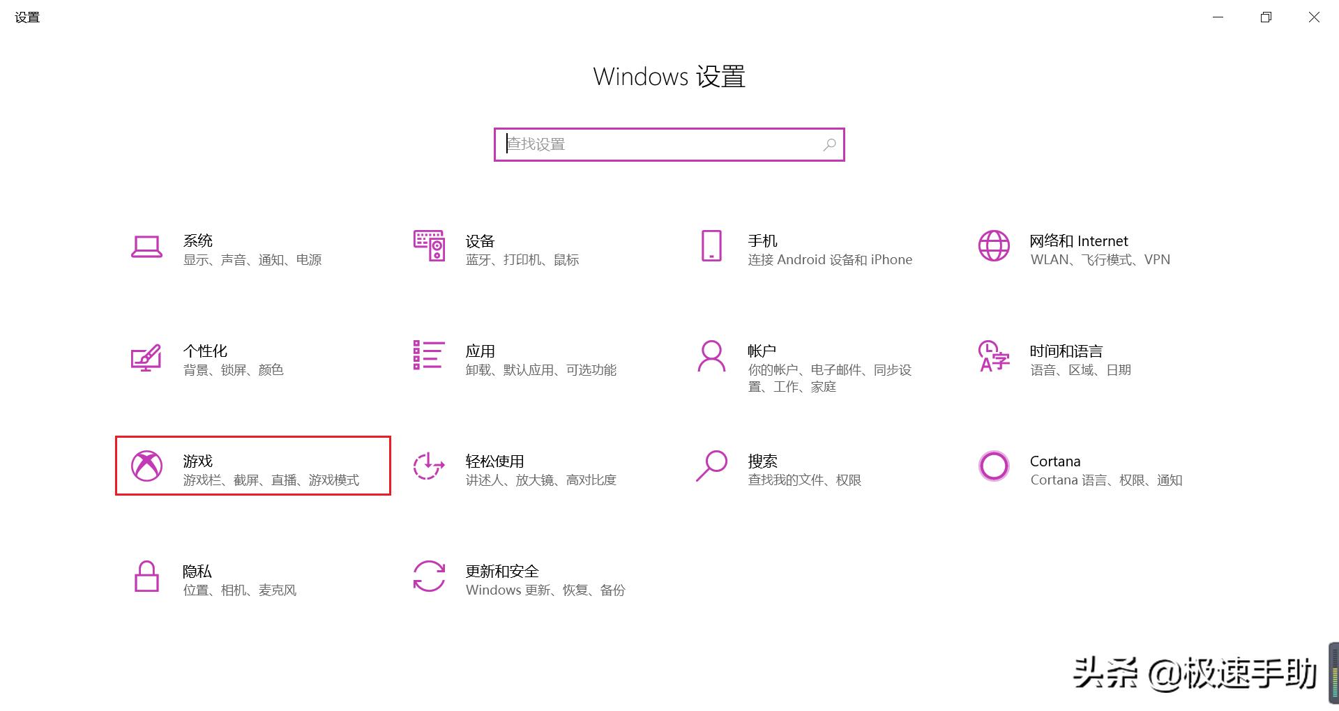 第二步,此时电脑就会弹出win10系统的设置界面,在此界面中,我们找到【游戏】选项,并点击进入。
