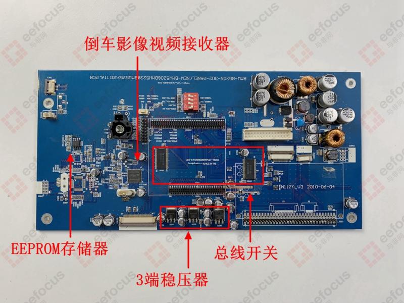 倒车影像视频接收器采用INOVA的INAP125R24,大功能底板搭载一颗Microchip的EEPROM存储器,存储中控屏主板的一些固件信息,同时主板还有一个拨码开关,猜测是调试屏幕驱动控制器的,在屏幕显示有问题的时候方便工程师调试。