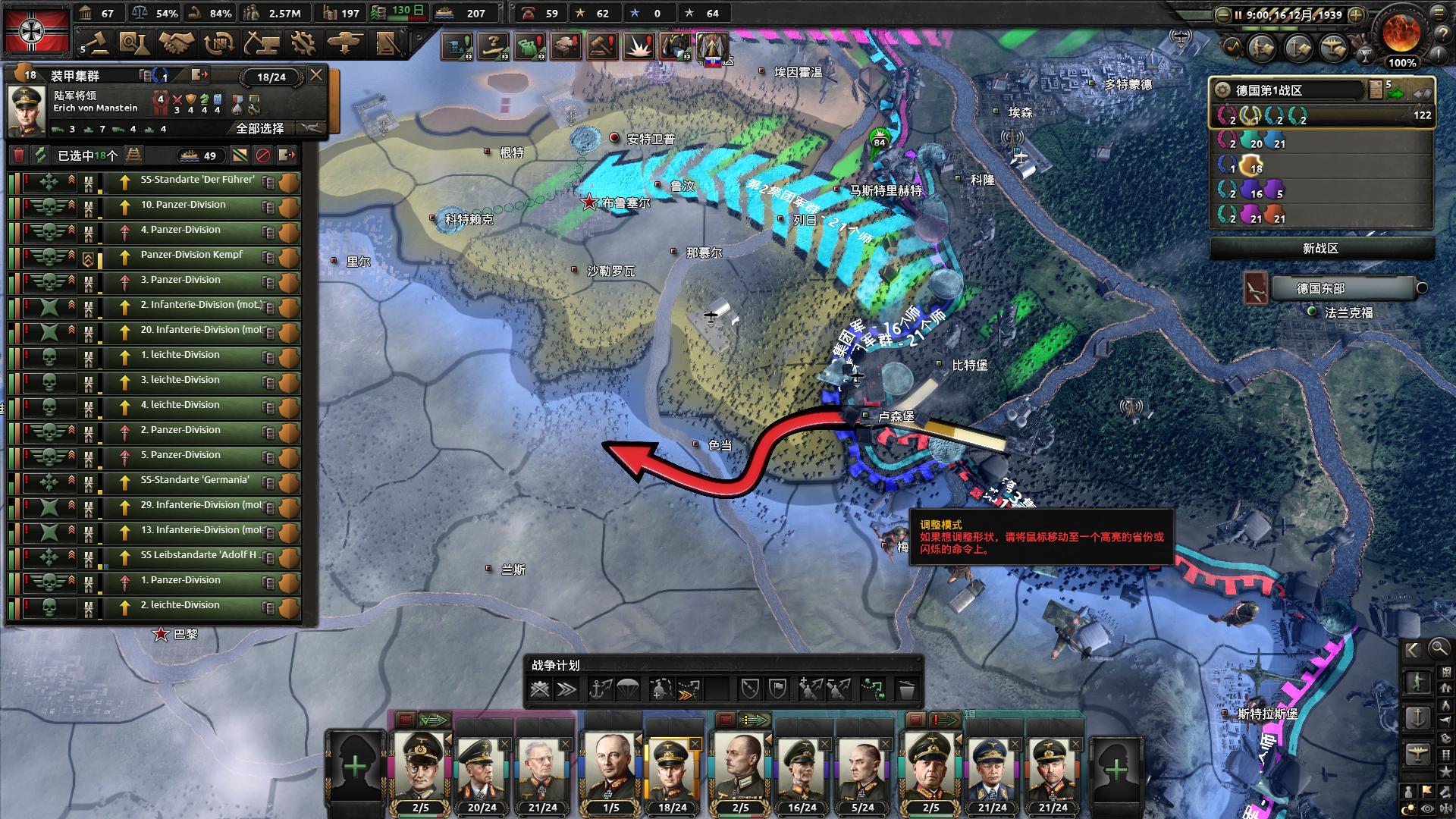 将其余步兵师、山地师、伞兵师稍稍整理一下,西线法国边境安排两个集团军驻守,其余的全部驻扎在德波边境以及瓦尔米亚地区,并给各个集团军划上进攻线。