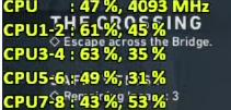 至于CPU的占用率,游戏在营地界面,一般CPU占用率在50%左右,而在战斗场面,8个线程可以都跑到70%以上。