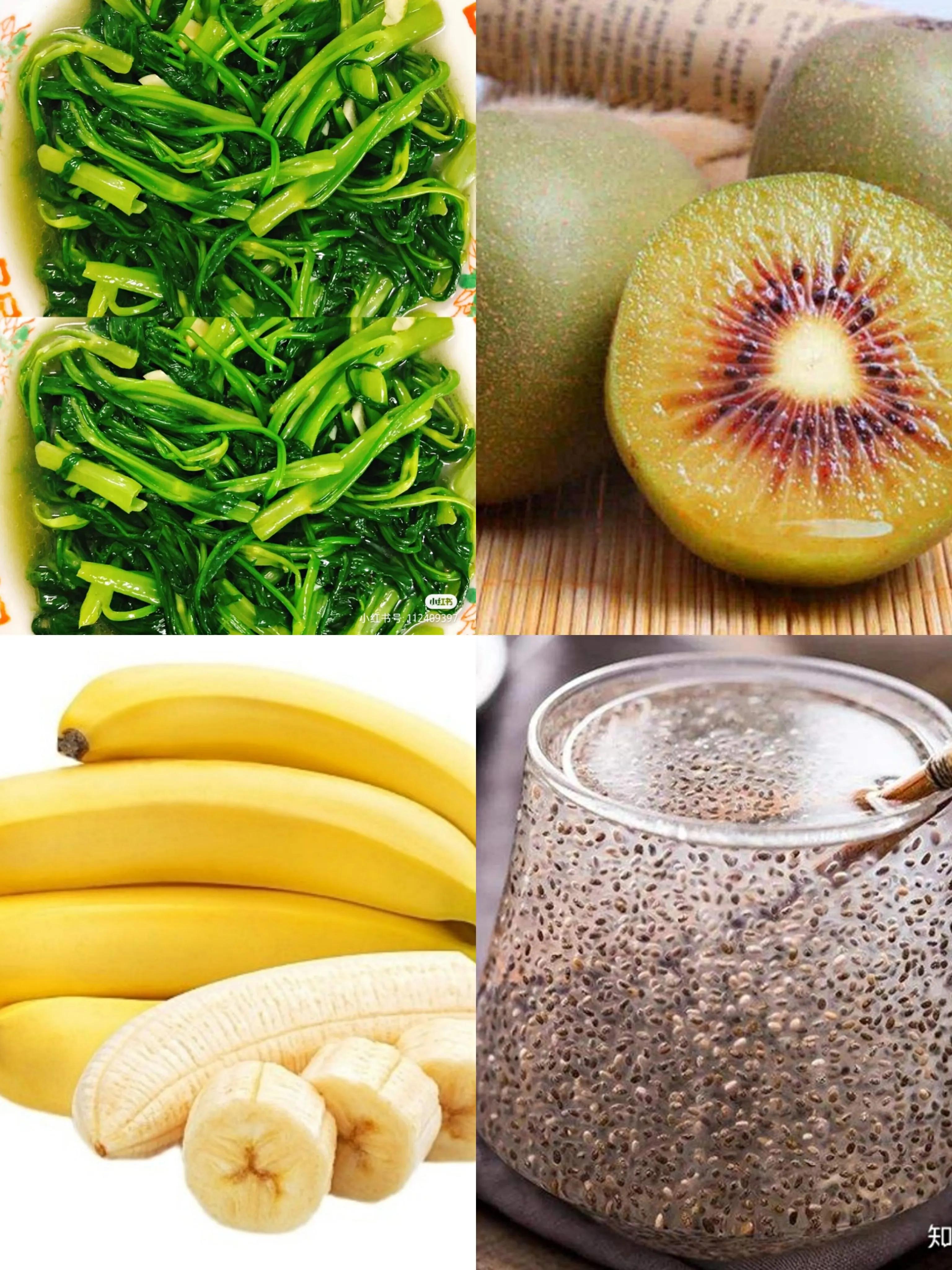 黑麦籽,猕猴桃,魔芋,空心菜,熟透的香蕉等
