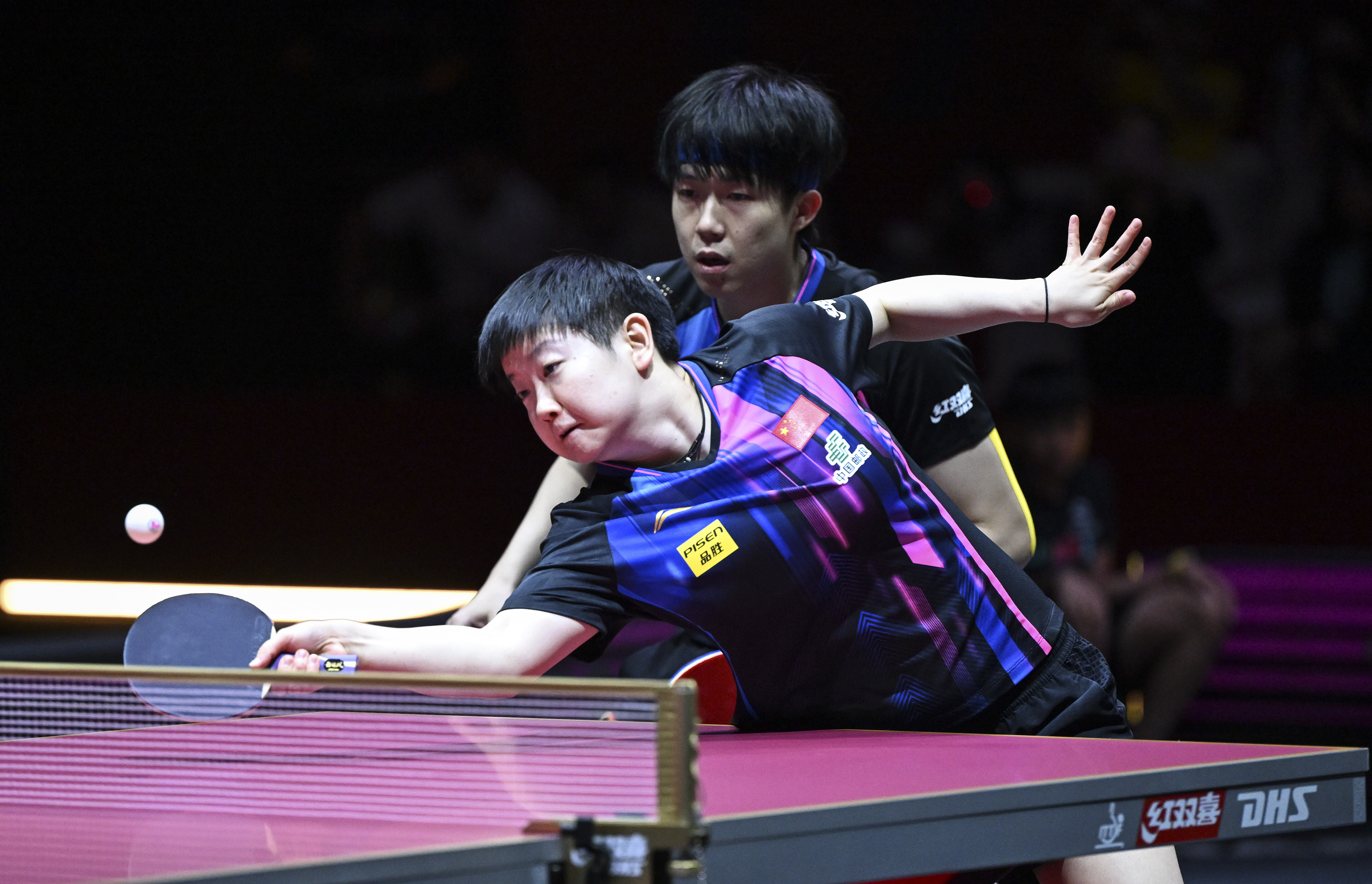 ↑ 王楚钦/孙颖莎(前)在比赛中回球。新华社记者 贺长山 摄