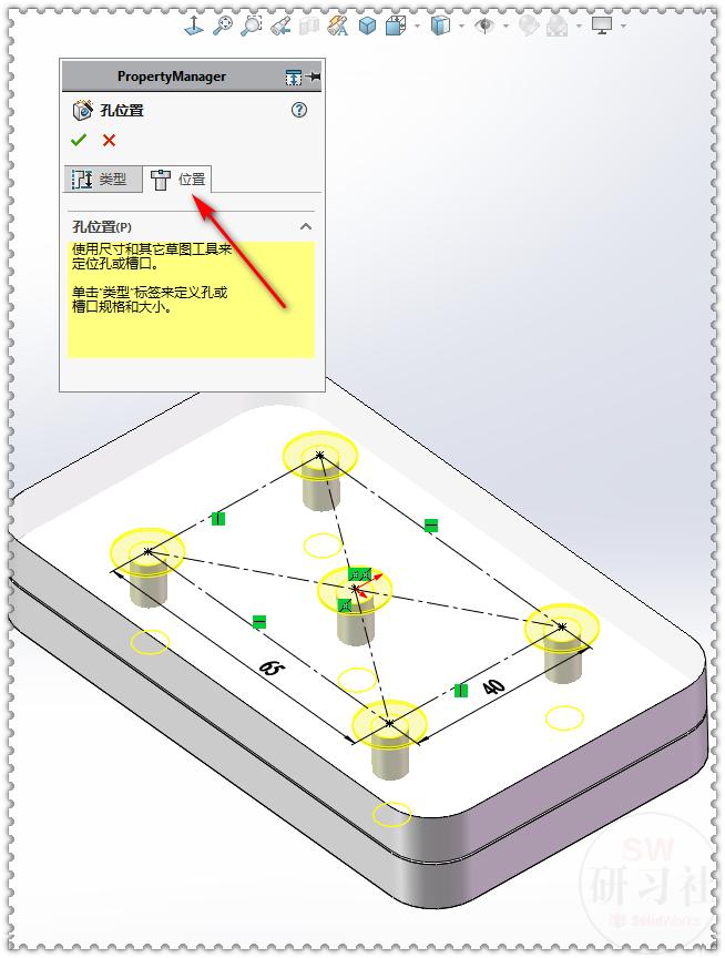 5.【异型孔向导】孔类型:柱形沉头孔;标准:GB,类型:T5780-2000;终止条件:完全贯穿。