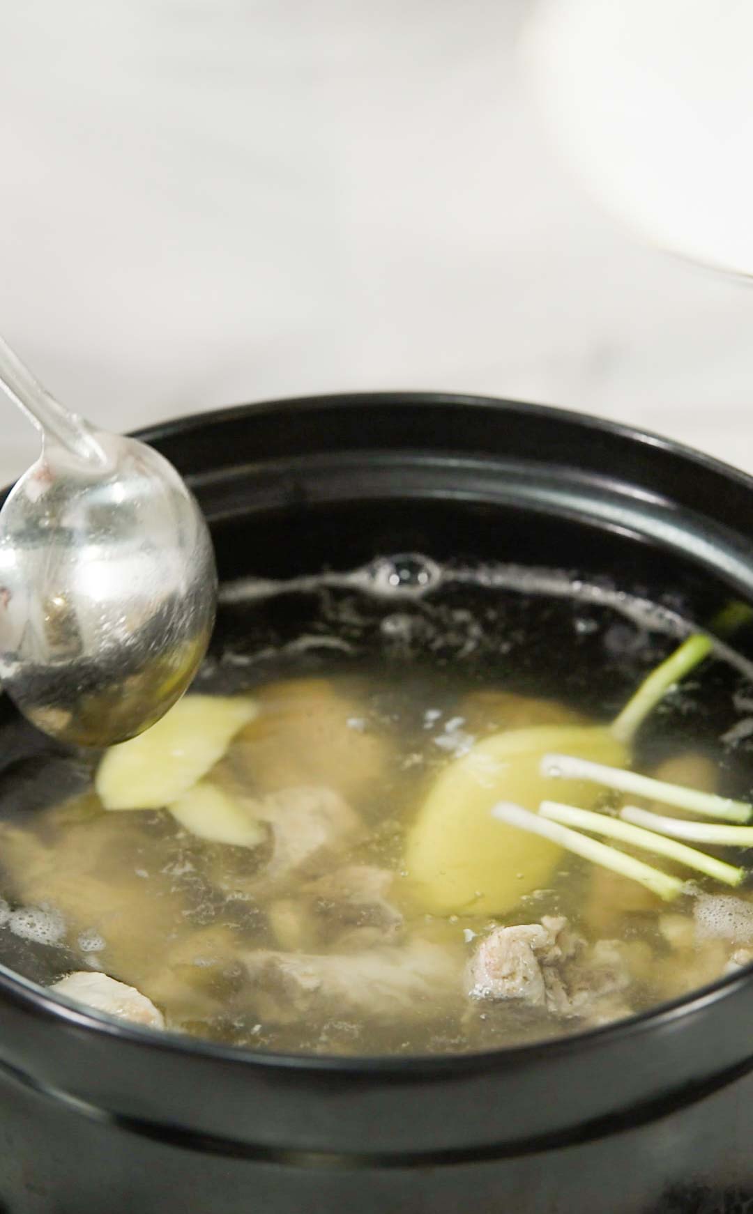 将之大火烧开,并加入适量料酒和葱蒜,并放入1克胡椒粒,再换成小火煲制半个小时。