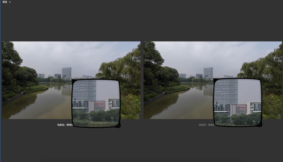 左:锐度低、降噪低;右:锐度高、降噪高