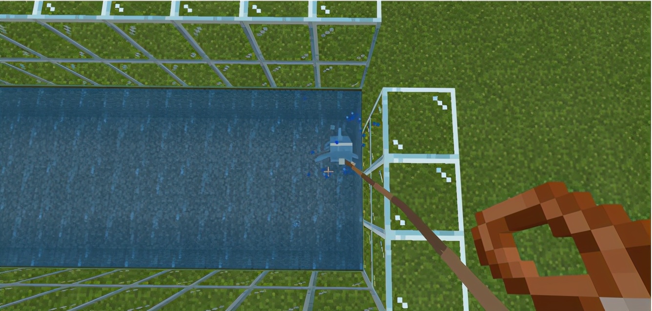 接着在旁边铺一段铁轨,拿起矿车右击它,你会发现矿车不见了!怎么回事呢?其实矿车已经通过指令,传送到海豚的身上了