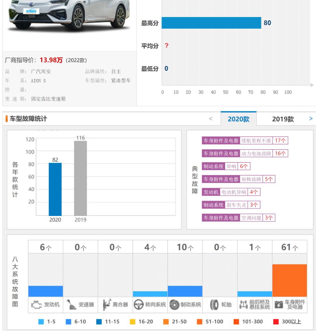 近日,在第三方质量投诉平台的车型故障统计中,2020年款广汽埃安S共出现82次故障,其中“车身附件及电器”方面的故障就有61次。而该车型2019年款同样在“车身附件及电器方面”表现“出彩”,一共统计出现79次故障。