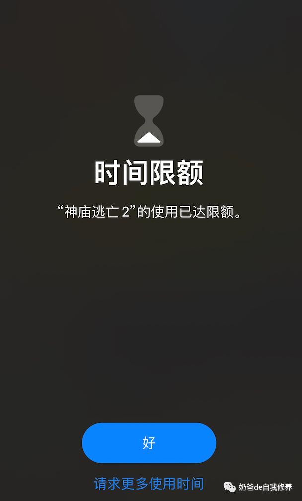 如果点“好”就会退出App。如果点“请求更多使用时间”,就会让孩子选择是“再多玩1分钟”呢?还是输入密码?