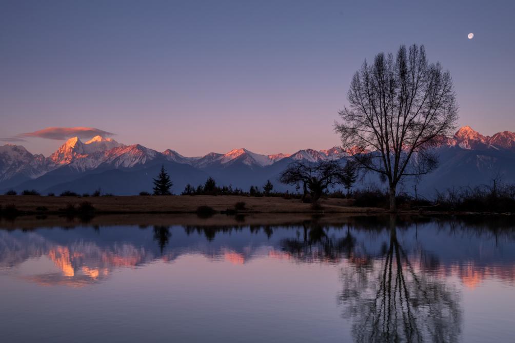 在风光摄影中,也经常会使用包围曝光功能,确保高光和暗部的细节。例如,这张照片拍摄于云南说达湖,这里是唯一能够看见梅里倒影的地方。在清晨日照金山的时刻,被阳光照射的雪山很亮,而水里的倒影相对较暗,为了确保金山和暗部细节,就需要包围曝光。