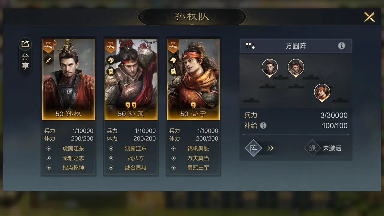 成型难度:孙策是送的,但孙权和甘宁需要在大池里捞,想玩这队建议早抽,限时卡池在关闭后所有武将和战法都会自动进入大池中,到时候就更难抽了。