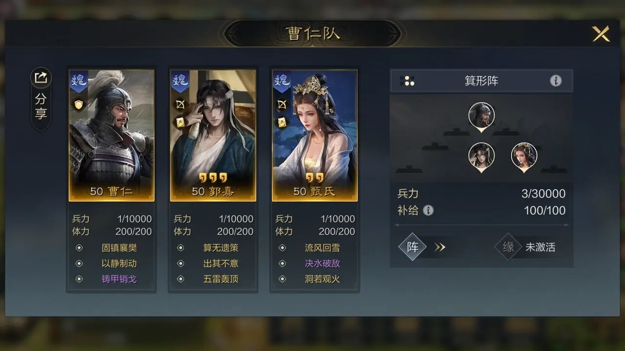 荀攸:根据实际情况自行搭配主动战法(谋略)或主动战法(治疗)