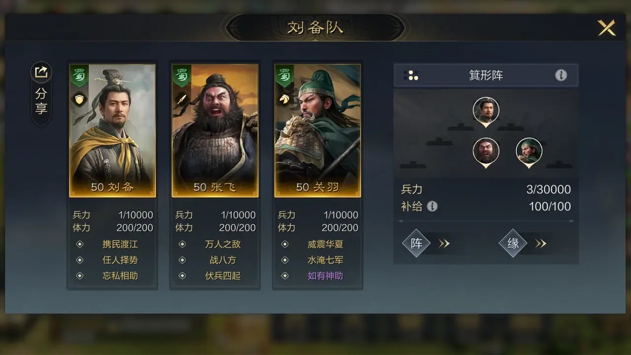 核心思路:刘备提供稳定治疗,张飞挂畏惧或震慑打副c,关羽主力输出,桃园结义缘分加成,这阵容打谁都是五五开。
