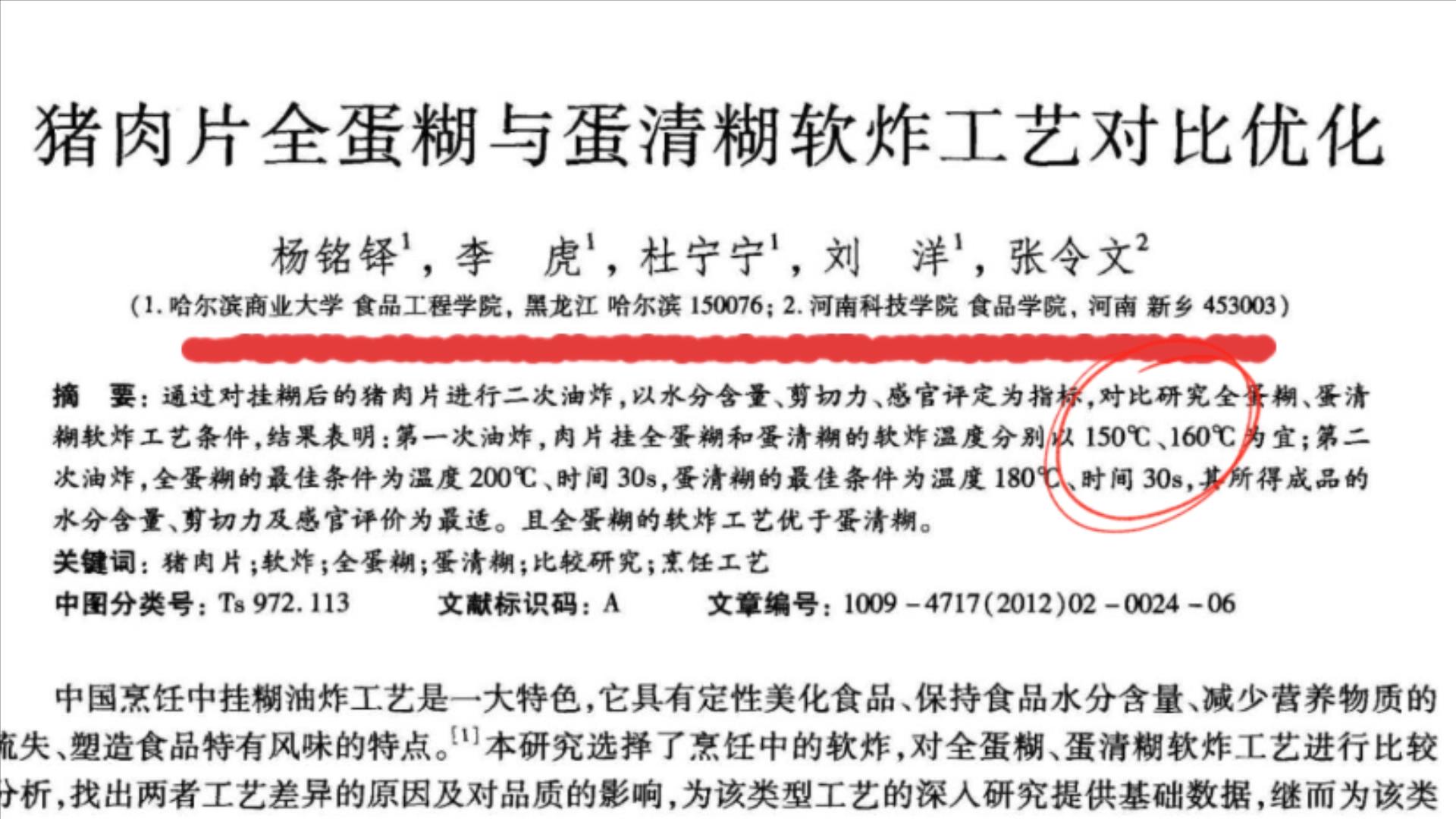 全蛋糊炸制时,最适合的油温是多少呢??全蛋糊最佳油温为5成左右,第一次炸制以150度左右为最佳,复炸以200度为最佳。这里有一篇论文,是来自于河南科技学院和哈尔滨商业大学的两所食品学院的论文,可以佐证这个观点。