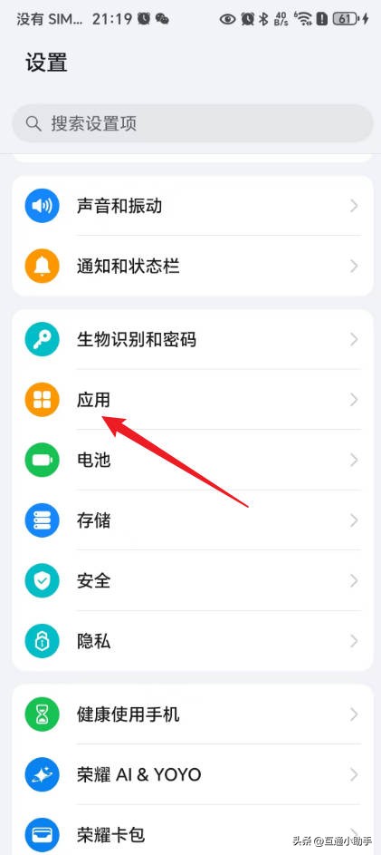 1、打开荣耀手机后,进入到设置页面,点击“应用”。