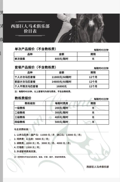 北京一家马术俱乐部,单次骑乘项目收费800元,45分钟,如果是上课,教练费还得另算。而县城马术俱乐部,一节马术课的价格普遍在两三百,如果是体验营,价格还更便宜。