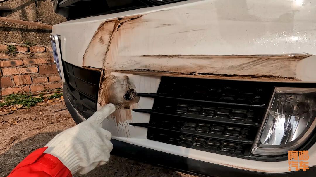 这种其实抛光一下,这个地方稍微补一下就可以了,完全没有必要去做整面的油漆。然后我们多用几遍柏油清洗剂让它作用一下,那些脏东西全部擦掉之后,我们发现这个小的破洞有一块油漆蹭掉了,其他地方完全都是完好的。你不是纯粹的完美主义者的话,这个保险杠我们就只要补一点油漆就可以了。