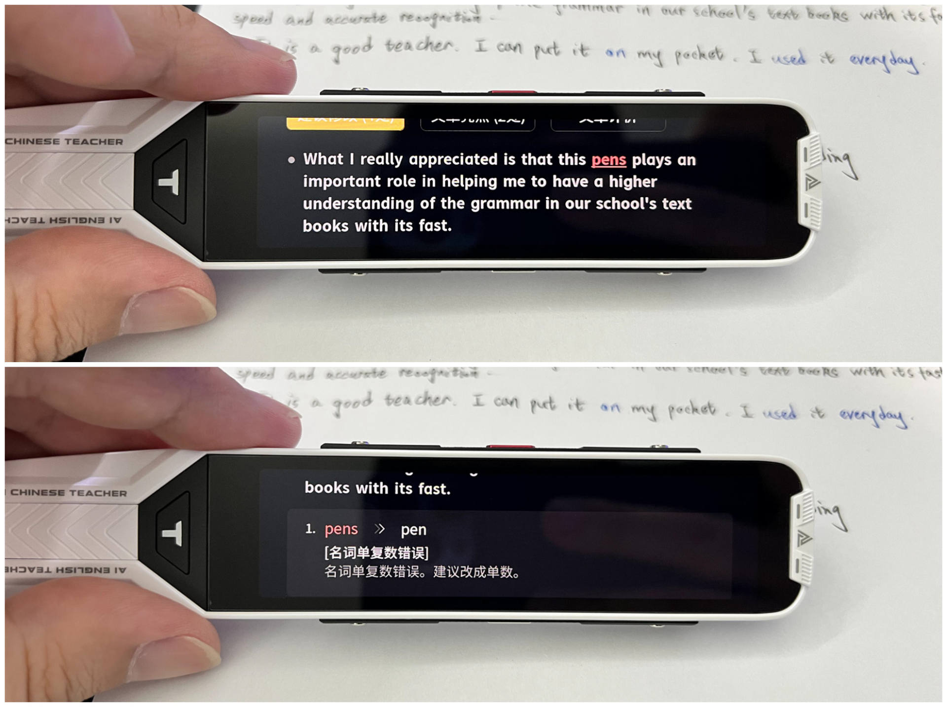 首先阿尔法蛋T10可进行作文批改、语法讲解教学。这是其它两款词典笔所不具备的。另外,程序在线库里几乎涵盖了各地小学到高中所有的英语课本版本。