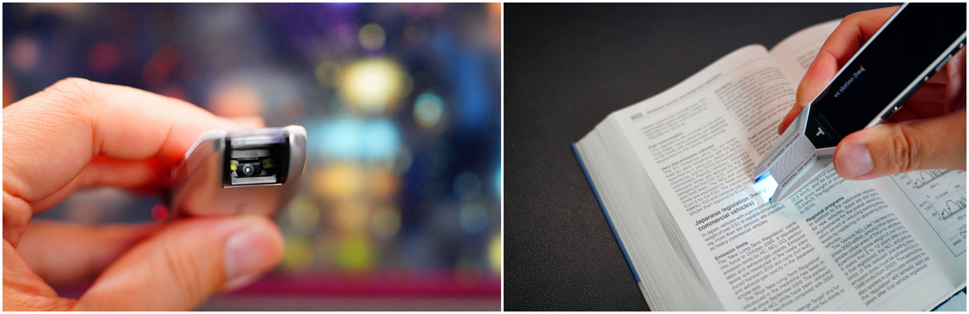 ▲笔头内置摄像头和两枚LED补光灯,当笔杆下压会激活灯光,接着横向扫描字词、句子,屏幕中会同步显示。