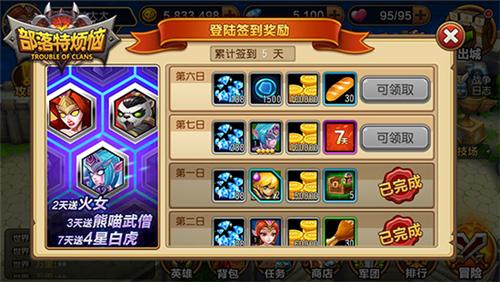3、签到获取:《部落特烦恼》的签到系统也是福利多多,只要每天上线进行签到就可拿到钻石奖励,同时与游戏中还有累计签到奖励,当总签到次数达到一定数量,又会有大量的钻石相送!