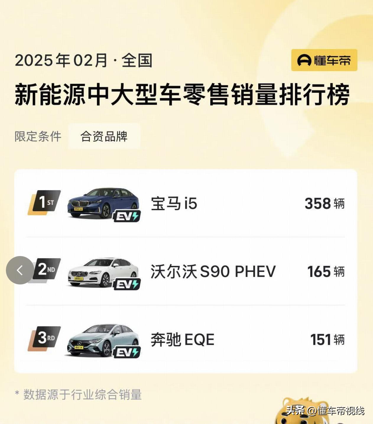 从懂车帝销量排行榜数据来看,2025年2月份,梅赛德斯-奔驰EQE销量为151辆,宝马i5销量为358辆。合资新能源中大型车还有很大的市场空间,大家觉得国产版的奥迪A6L e-tron未来上市销量如何,欢迎在评论区留言。