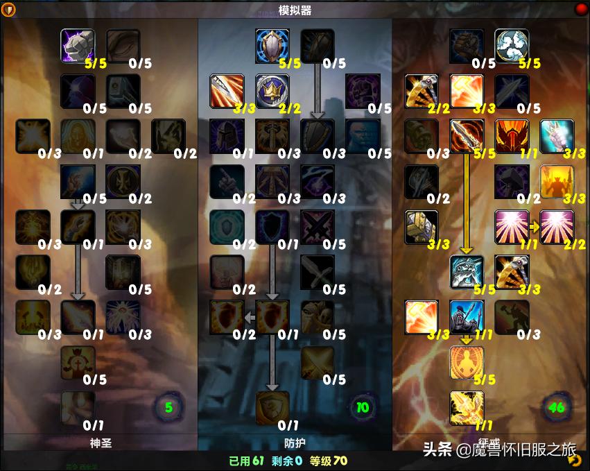 60-70阶段,点出神圣第一层神圣之力,和防护第二层精确,剩余两点天赋可以随意发挥,推荐点防护第二层的防护者的宠爱,减少保护祝福的cd,毕竟保护祝福在对物理怪的时候相当于小无敌,防止因为拉多了小怪翻车