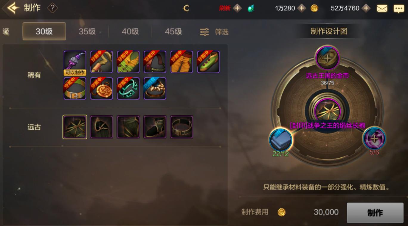 在我们30-50级期间,就可以开始着手制作一些远古地下城装备以及传承粉装了。只要材料和金币充足,我们就可以制作。