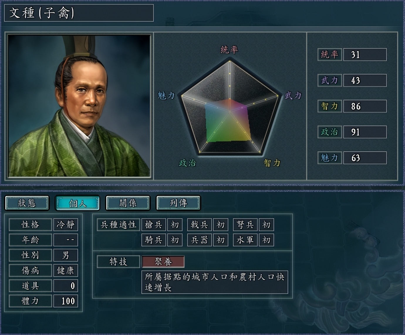 范蠡拥有着仅次于张良的智力值,108的智力位居全人物的第二位,不可谓不高了。