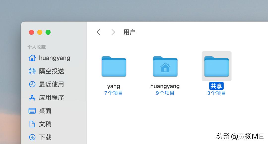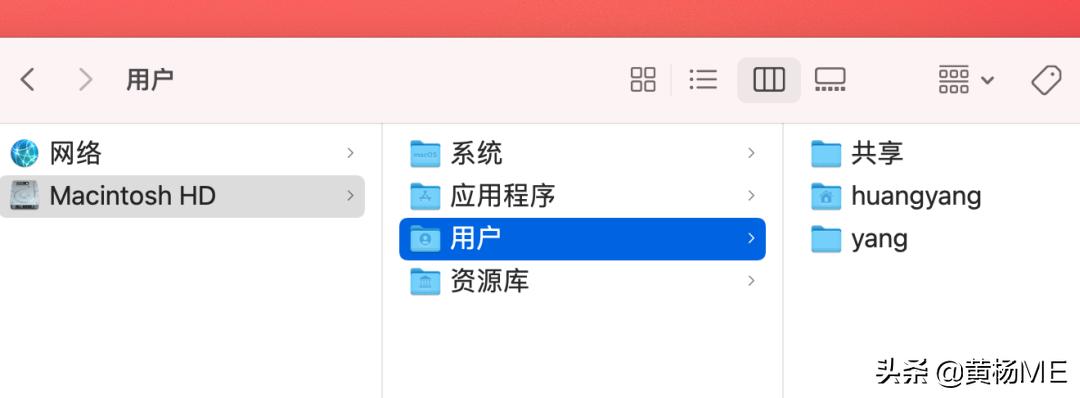 比如我的 Mac 创建了两个用户「黄杨」和「yang」,在「用户」文件夹中就有两个以用户名命名的文件夹huangyang和yang。