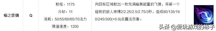 ②Q技能:暗之禁锢。莫甘娜向前方发射飞弹,碰到的第一个敌人将被会舒服2-3秒,并造成魔法伤害。莫甘娜的Q技能不仅可以作为一个优先的先手技能,而且还可以作为一个不从的反手技能,先手和反手效果兼备得益于莫甘娜Q技能的距离设置(先手距离远,反手距离短)和控制时间长(2-3秒)。在“莫甘娜加女坦”组合中,莫甘娜Q技能通常作为控制链的最后一环。
