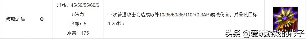 ②Q技能:破晓之盾。使用Q技能后,女坦的下次普通攻击会造成额外的魔法伤害,并控制该目标1.25秒。女坦Q技能的技能范围较近,大致跟平A距离相当,但可以跟E技能产生联动,打出EAQA的控制链效果,加之被动“日光”的伤害,一套技能的爆发伤害尚可。再加上莫甘娜Q技能的控制和W技能的伤害,对面被控制的英雄非死即残,这就是“莫甘娜加女坦”组合的恐怖之处!