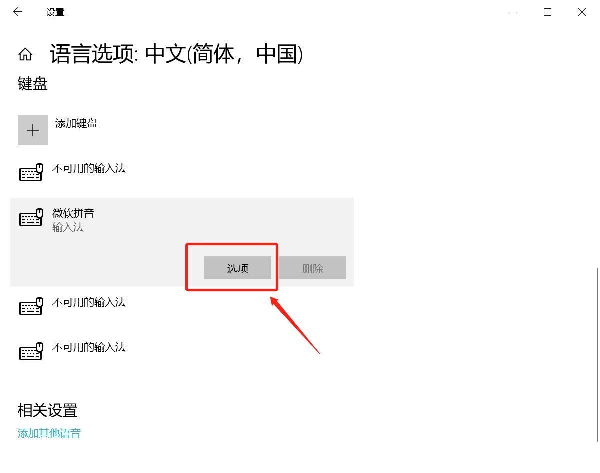 2、进入到时间和语言设置面板中,找到【语言】,下拉右侧找到电脑语言设置,点开,进入【选项】中