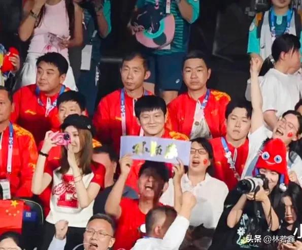 在第二盘孙颖莎对阵平野美宇的时候,国乒男团,马龙,王楚钦,樊振东来到了现场为女团加油打气,