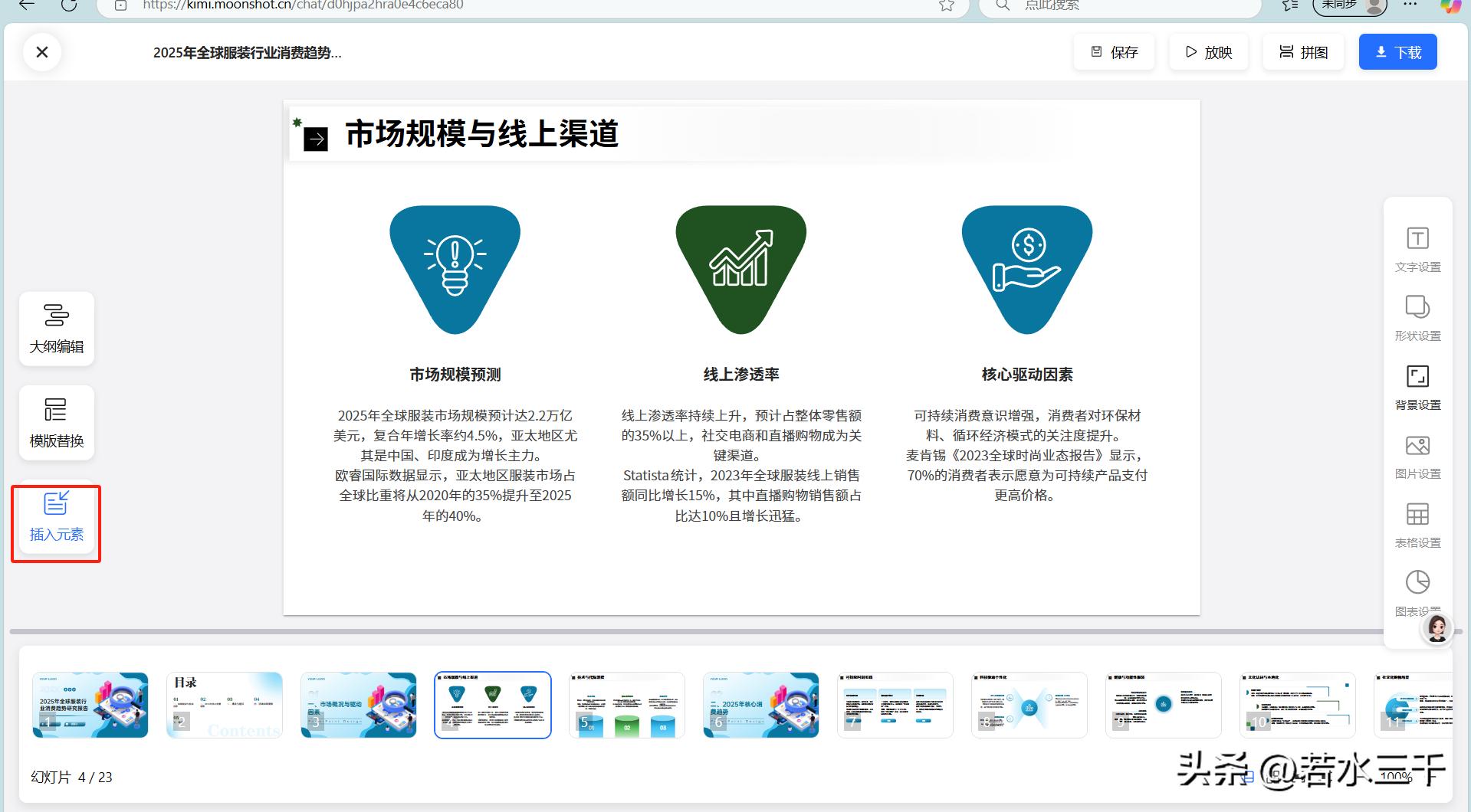 以上通过Deepseek生成大纲后,再利用Kimi的PPT助手再生成PPT,其实也可以直接用kimi大模型直接生成大纲,并且直接@PPT助手,就可以一步生成大纲和PPT,如下图