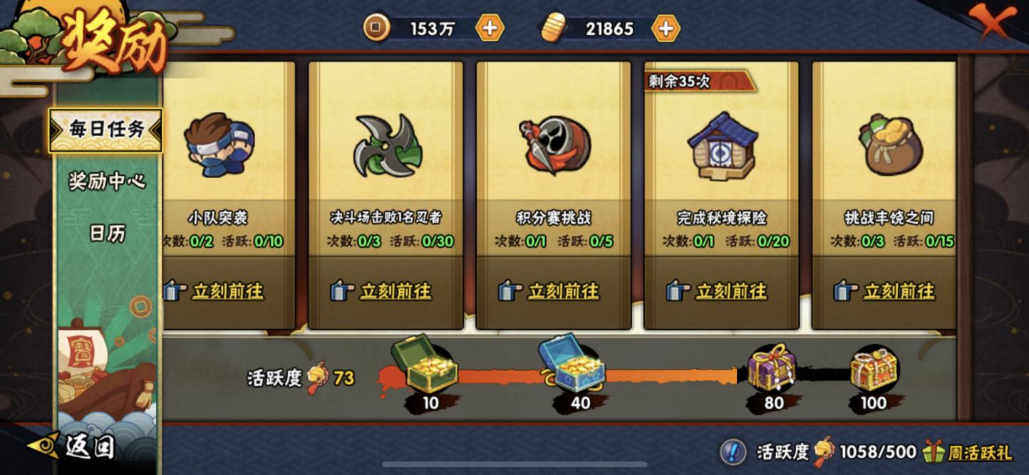 可能一些低战力的玩家在做日常的时候会消耗更多的时间,比如丰饶之间、秘境副本等等,但其实火影忍者手游每天的活跃宝箱只需要达到100就能够拿满,而提供的活跃度任务远不止100,你可以选择一些比较简单的来做,基本上也不会消耗太多的时间。而每周的决斗场20胜,只需要在原来完成日常的基础上再略微增加一些时间就足够了,我是真的没有感觉到这款游戏有多肝。