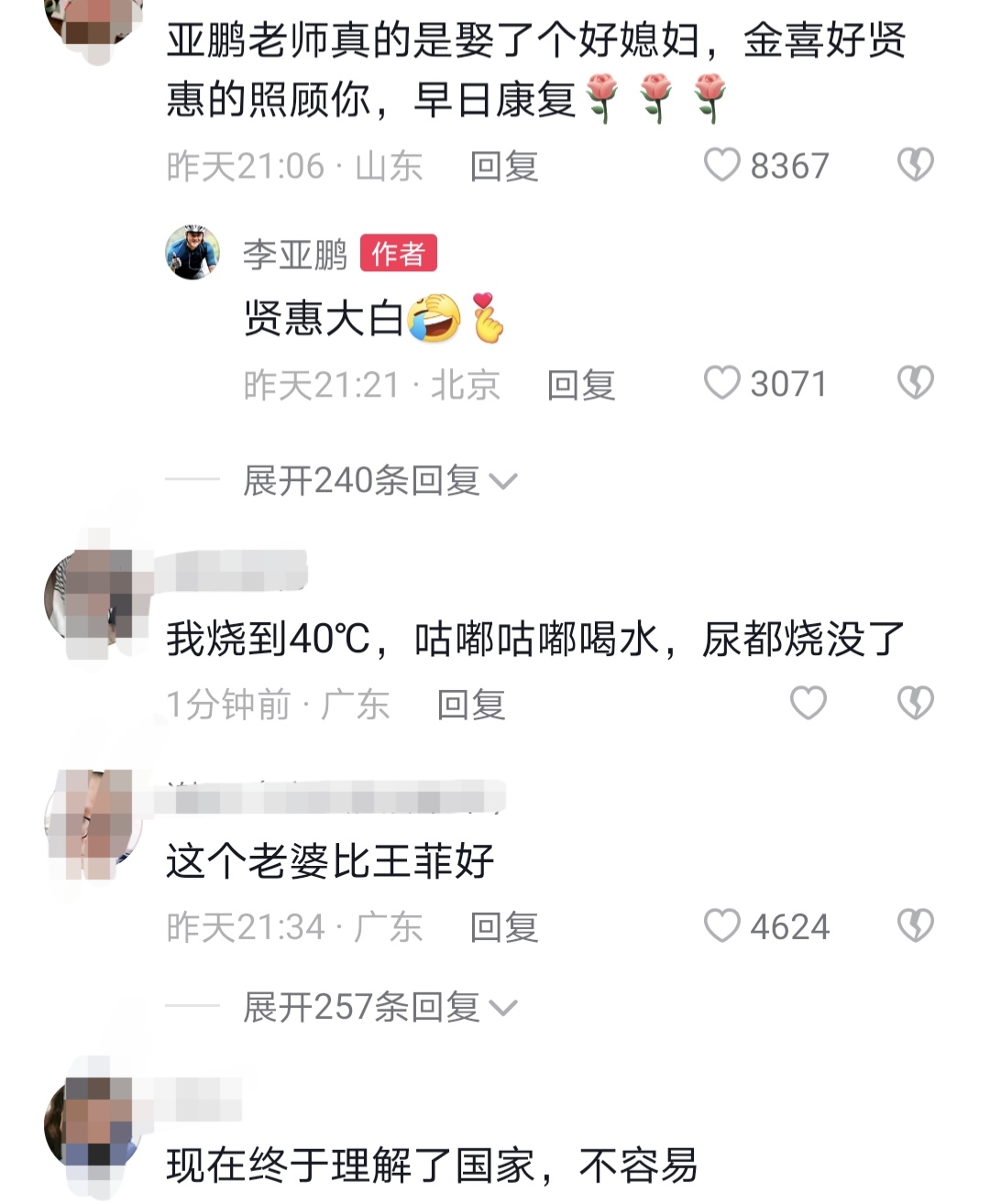翻看评论区,有不少网友赞叹李亚鹏娶了好媳妇,还直言女方比王菲要强很多。想必在这样好的妻子照顾下,李亚鹏也能很快恢复。
