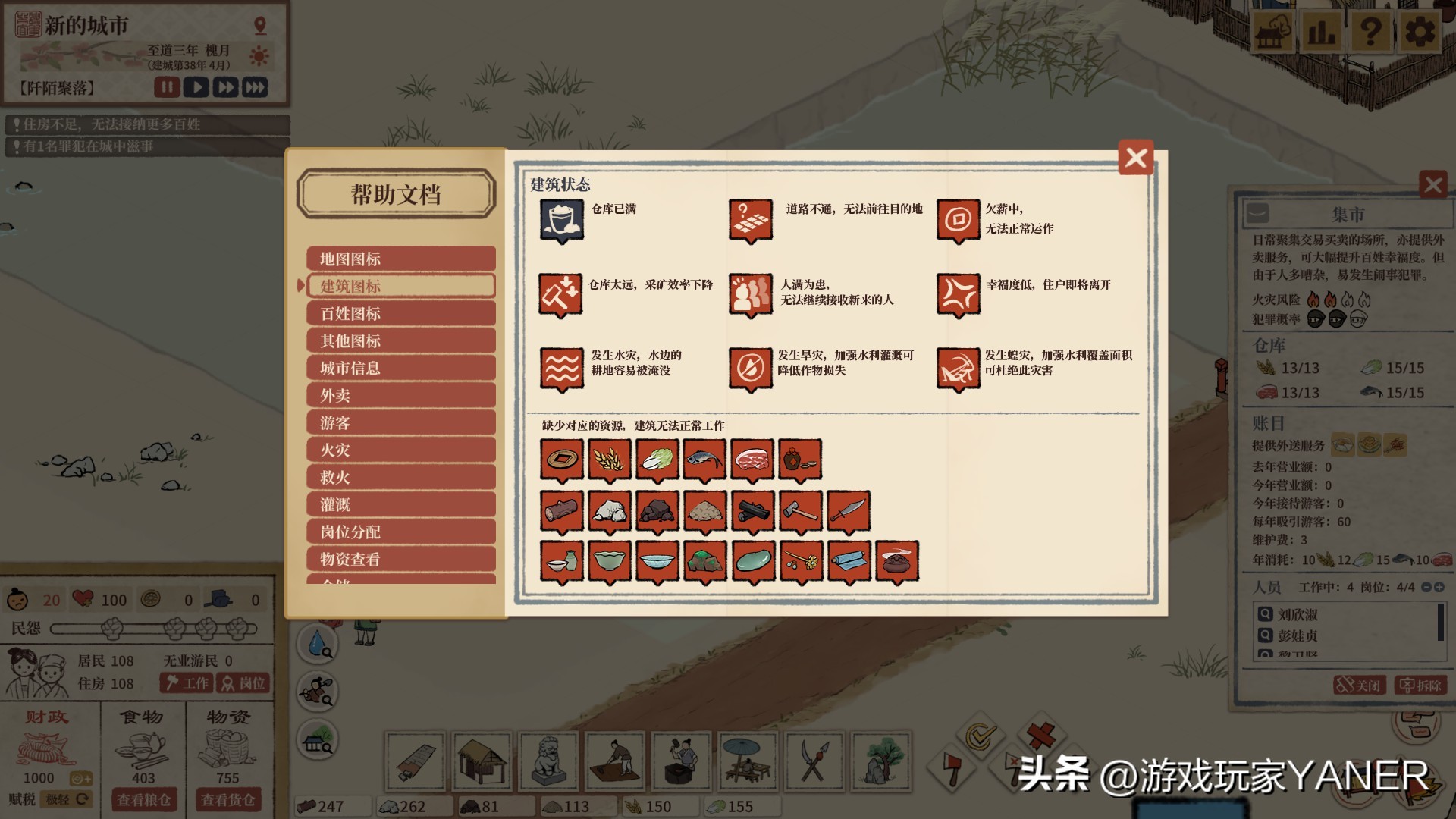 在解决住房和道路之后就是对当前百姓需求的供应和民政等规划了,你需要在冬季来临之前囤积粮草,进行务农百工,收集木材石材等消耗资源,同时注意灾害疫病,市井游客,抵御外族入侵,提供科举人才等等的规划和管理。