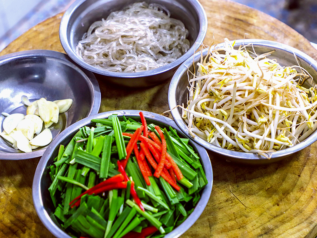 2.锅内烧油,把油烧热倒入蒜片,加入蚝油5克翻炒化开蚝油,放入绿豆芽、韭菜继续翻炒,然后放入泡软的粉条翻匀,加入食盐2克、鸡粉1克、胡椒粉1克、白糖少许、老抽3克提色,开大火快速颠锅翻炒给食材上色,翻匀后即可出锅装盘。