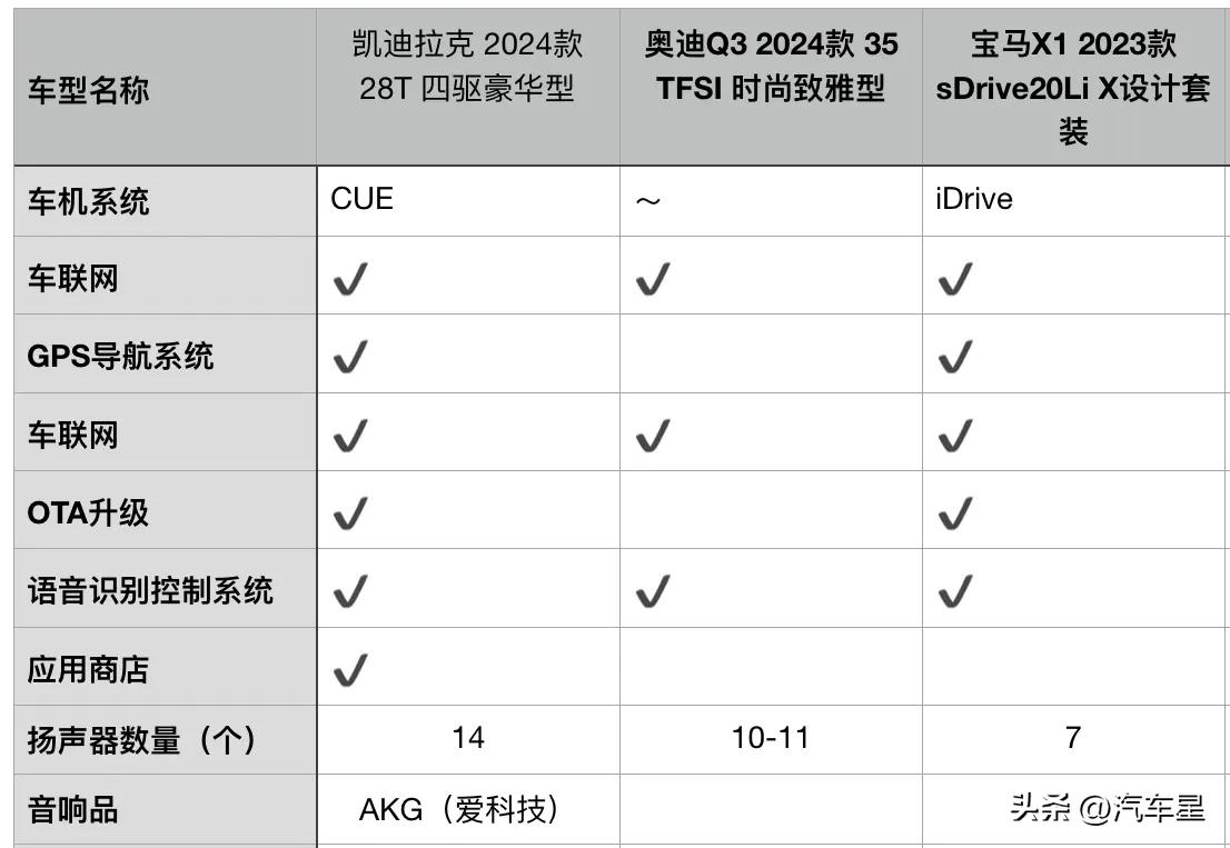 在同级别车型当中,我们进行了简单的对比,发现在主动和被动安全方面凯迪拉克XT4和宝马X1挺丰富的,宝马X1在辅助驾驶方面还多出了自动泊车入位功能,而奥迪Q3的部分安全功能和辅助配置需要选装。