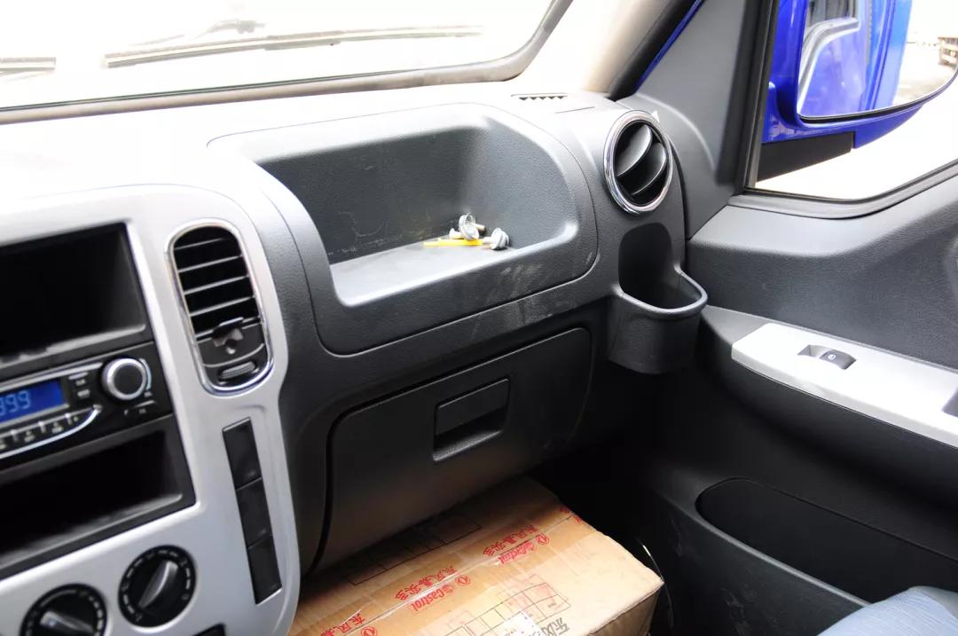 驾驶室不宽,但是横向配置了三张座椅,中间的座椅尺寸很小,采用了轻卡一样的翻折设计,不用的时候可以当做一个储物平台,中控是朝向驾驶员一侧设计的,方便行车操作。