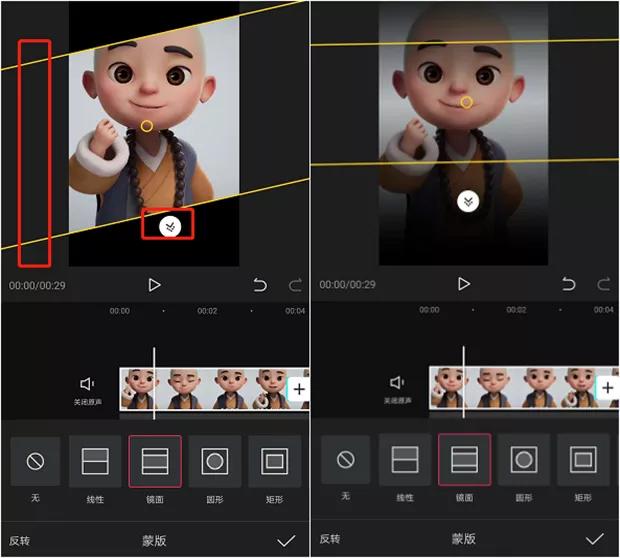 线性蒙版:用一只手指拖动蒙版调位置,两只手指拖动蒙版旋转调角度,拖动下方白色“箭头”按钮可以羽化视频。