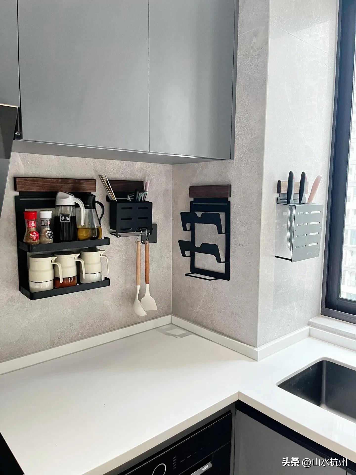 找到了一组尺寸刚好的置物架,免钉胶黏在墙面,不占台面位置胡桃木色十黑色置物架和厨房现代搭调料架 筷子架窝架 ,刀架, 完全能满足日常收