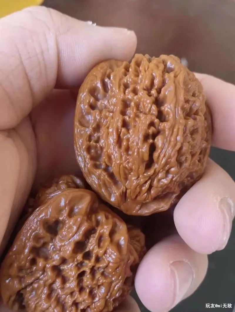 即便问题多多,但也有玩友用钢丝刷打底出良好效果的例子,比如玩友@mi无敌 ,他晒出了一对不到俩月的南疆石核桃。