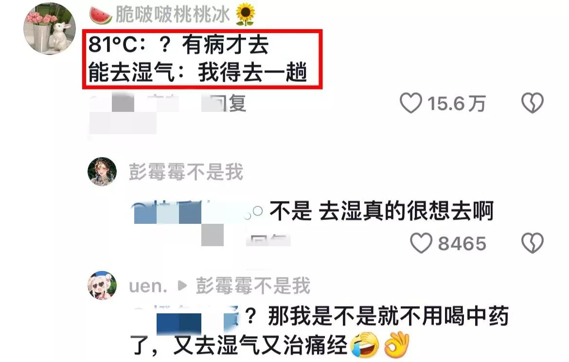 网友表示,不但能祛湿气还能减肥,去时一百三十斤,回来直接一百零五斤。有没有可能是把身体里的水分蒸发了。哈哈哈