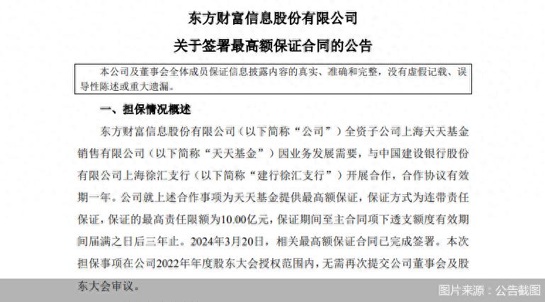 东方财富为天天基金合作事项提供最高额保证 最高责任限额为10亿元