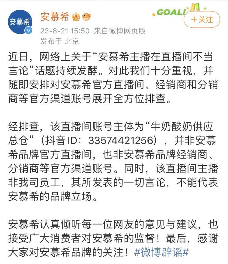 8月21日15点50分,安慕希就主播在直播间不当言论事件在其官方微博发布声明称,直播间账号主体为“牛奶酸奶供应总仓”(抖音ID:33574421256),并非安慕希品牌官方直播间,也非安慕希品牌经销商、分销商等官方渠道账号。同时称该主播并非公司员工,所发表的一切言论不能代表安慕希的品牌立场。
