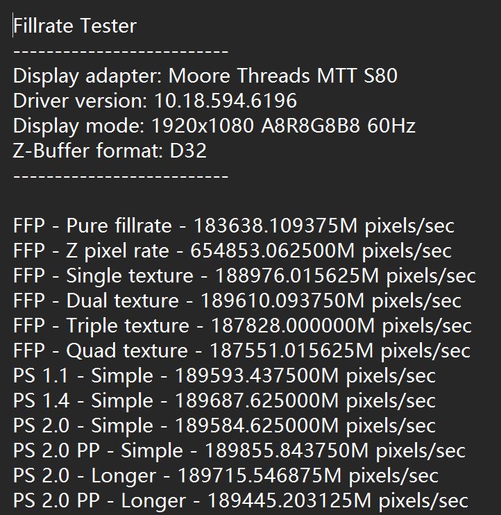 在 Fillrate Tester 实测中 MTT S80 的像素填充率 FFP - Single texture 成绩为 188 GPixel / s。相比之下,RTX 3060 的像素填充率为 85.30 GPixel / s,RTX 3080Ti 的像素填充率为 186.5 GPixel / s。